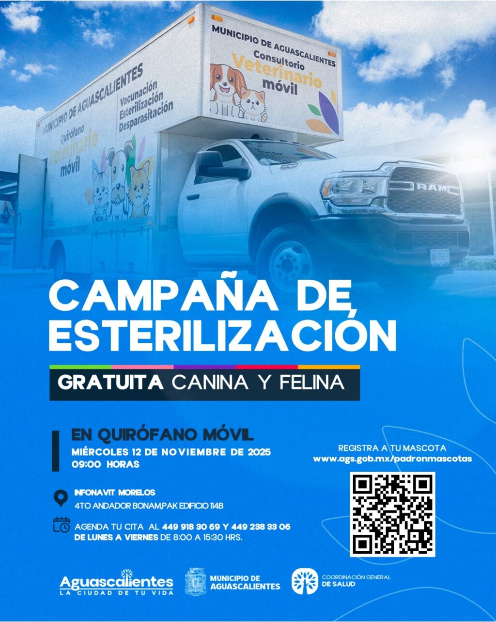 La coordinadora general de Salud del Municipio de Aguascalientes, María Teresa Rendón Esquivel, anunció que el Quirófano Veterinario Móvil estará en el Infonavit Morelos y en la comunidad Tanque de los Jiménez para ofrecer los servicios de esterilización, vacunación antirrábica y desparasitación los días 12 y 13 de noviembre del 2025.