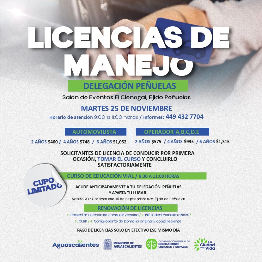 El Municipio de Aguascalientes invita a la ciudadanía a renovar su licencia de manejo este próximo martes 25 de noviembre en la jornada que se llevará a cabo en el Ejido Peñuelas, con sede en el Salón de Eventos el Cienegal, ubicado en la zona sur de la ciudad de Aguascalientes.