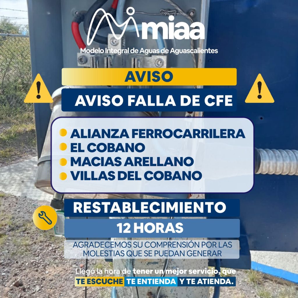 A nuestros usuarios de las siguientes zonas les informamos que el pozo que los abastece sufrió una falla eléctrica y nos encontramos a la espera de que sea atendido por la CFE.
