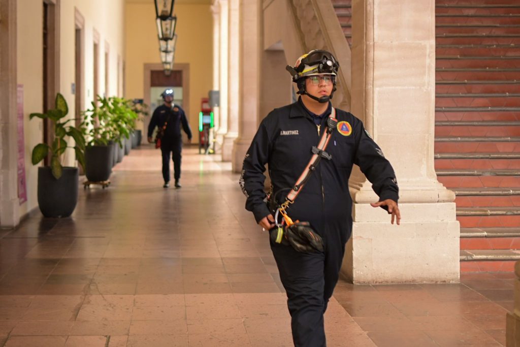 A Palacio Municipal arribaron unidades e integrantes de la Coordinación Municipal de Protección Civil, Bomberos y Paramédicos, quienes revisaron el edificio para asegurarse que no permaneciera nadie al interior, brindar, de haber sido necesario, el auxilio correspondiente a alguna persona y ubicar posibles daños estructurales en el inmueble.