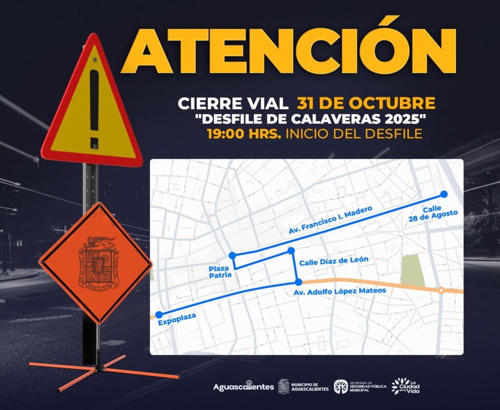 Con motivo del Desfile de Calaveras, la Secretaría de Seguridad Pública Municipal de Aguascalientes (SSPM) desplegará un operativo vial el viernes 31 de octubre, que incluirá cierres en diferentes puntos de la ciudad.